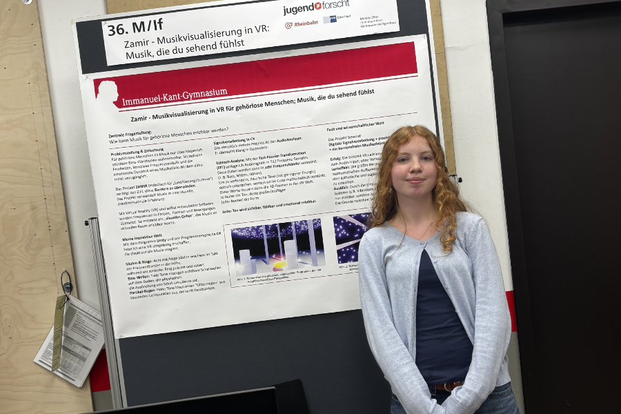 Matilda E. (10c) erreichte mit ihrem Projekt „Zamir – Musikvisualisierung in VR für gehörlose Menschen: Musik, die du sehend fühlst“ den 3. Platz im Fachbereich Mathematik/Informatik. Zusätzlich erhielt sie den Sonderpreis der Ministerin für Schule und Bildung für die schöpferisch wertvollste Arbeit.